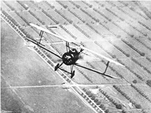 which later would have proved invaluable to me. We were over the lines at between 10,000 & 12,000 feet and had patrolled from Bethune to a distance somewhat South of Lens. We had been out about one hour and a quarter and although quite a way East so far had encountered no Huns. We were going directly South and East of Lens when the flight turned completely around to the right going then straight North. I was flying on the outside right and this complete change of direction left me a little behind. I put my nose down to regain my position, at the same time I spotted three machines flying above and across my flight commanders nose bound Southeast. At first I mistook them for Bristols and before I could decide exactly what they were, two of them turned nose on for me at the same time opening fire. I could see plainly the long swish of smoke left in the trail of the fast approaching bullets, at the same time the two machines were gaining on me. I did my best by climbing, turning in different directions to out-manoeuvre them, but unfortunately they seemed to have me at a sad disadvantage. To make things worse