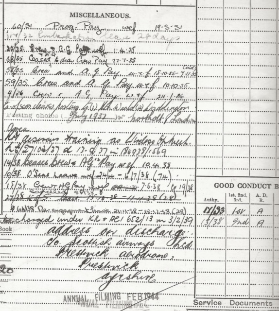 from the photograph on the left that he seems to have kept his nose clean and was assessed as very good for the 9 years he was in the RAF; gaining two good conduct badges, one in 1933 and the other in 1938.