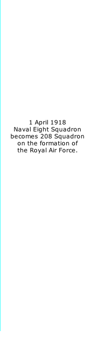 On 1 April 1918, the R.F.C. and R.N.A.S. were amalgamated as the Royal Air Force; we lost our Naval status and became No. 208 Squadron R.A.F. I know that, to the last man, we were very upset at the change. After being “borne on the books” of H.M. Ships for so long it seemed impossible to suddenly switch from the Naval Ranks, Ratings and Routine we knew so well, to those of the Army, adopted by the R.A.F., which were completely foreign. From a Squadron Commander, R.N., I became a Major, R.A.F., and my Flight Commanders became Captains and the Petty Officers, Sergeants. (The present-day officer ranks were not introduced until 1920.) Gone were Watch-keeping, Liberty-men, the Master-at-Arms, or “Jaunty,” the Duty Petty Officer who would report to the Officer of the Watch : “Liberty Boat along-side, Sir,” the Ship’s Bell, complete with snow-white clanging rope, and the chaps asking: “permission to go ashore, Sir,” which made the local Army and our visitors howl with delight, considering we were so many miles from the sea.