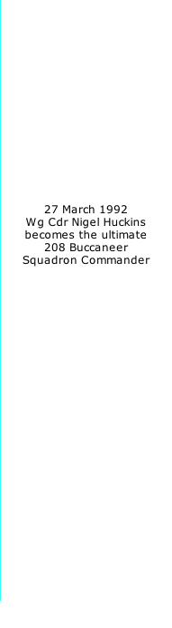 208 Sqn had already taken over the RAF laser designation commitment from the Thermal Imaging Airborne Laser Designation (TIALD) equipped Tornado aircraft of 617 Sqn. This involved the extensive modification of several aircraft and the training of eight crews. Despite our best pleas and the sacrifice of several 12 Sqn virgins, our aspiration to get Tony Lunnon-Wood (TLW) to be the last boss didn’t work out. Instead, Nige Huckins took the reins in March 1992. He had the benefit of doing his work up on the Buccaneer Training Unit (BTU), following the demise of 237 OCU, which gave him the ideal opportunity to see how the Sqn was running and canvass opinions from the ‘shop floor’ – obviously there were many of those. Some of the best suggestions of how to end in a blaze of glory included: Las Vegas, to take part in a final Red Flag (which didn’t happen) and South Africa to visit 24 Sqn (which didn’t happen either). Of note Phil O’Dell did manage to get there on his own with XW986 but that’s his story to tell.