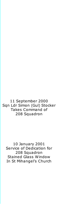 On 10th January 2001 there was a Service of Dedication for the 208 Squadron stained glass window in St Mihangel’s Church. The work was designed and produced by the Station Commander’s wife, Mrs Karen Newby and was dedicated by the Rt Reverend J D G Kirkham, the Bishop to Her Majesty’s Forces. The window commemorates the courage and dedication of all 208 Squadron members, as well as the role of the Squadron in maintaining the standards of flying within the fast-jet stream of Royal Air Force flying training. In detail, the Squadron crest surmounts a pair of pilots’ wings, under which is written ‘They shall rise upon wings as eagles’ - the blessing from Isiah 40 that was used in the dedication service when the students graduated and were presented with their ‘wings.’