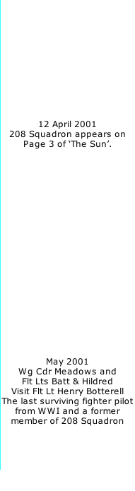 what was the most memorable event of my time in command. This time, however, it was the Toronto Sun, which reported our visit to meet Flt Lt Henry Botterell (11) who, at 104, was the last surviving pilot from WWI and a former member of 208 Squadron to boot. The Sunday Times (13th May) also reported the visit. Finding Henry was the most remarkable coincidence. I am an avid aviation art collector, and I hope you have all enjoyed the 208 Squadron elements of my collection, which I have brought
