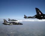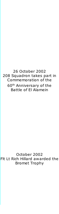 privileged to lead a 4-ship flypast of Perth to celebrate the 60th Anniversary of the Battle of El-Alamein on 26th October 2002 (27), thus linking the exploits of the Squadron of the past with the training task of the present. At the time, there were only 4 squadrons still flying that had served in the battles of El-Alamein. Launching out of RAF Leuchars, a Dominie of 55 Squadron and a Hercules of 70 Squadron were followed by a ‘box-4’ of Jaguars from 6 Squadron (the Flying Canopeners) and a ‘box-4’ from 208 Squadron (the Flying Shuftis). All aircraft flew down the main parade line, after which both the 6 Squadron and 208 Squadron elements returned to fly a ‘missing man’ finger-4 formation over the saluting base to honour fallen comrades. This was also the day of the association reunion so, following the flypasts, in one of the longest Hawk sorties I have ever flown (1:40) I flew on to RAF Lyneham in Wiltshire and then onwards by train to London to the Club, where I was also honoured to meet 2 former members of the Squadron who had served at the time of the Battle of El-Alamein. At that same Reunion Dinner in October 2002, an outstanding display season by Flight Lieutenant Rich Hillard, earned him the coveted Bromet Trophy and a C-in-C’s Commendation for excellence in the air.
