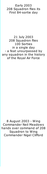 he same reason that you might climb Everest - because the challenge is there - in order to prove the robustness of our new system of operations, the Squadron flew 100 sorties in a single day (36) on 21 July 2003 – a feat unsurpassed by any other squadron in the history of the RAF, and a record which seems unlikely ever to be challenged. What was remarkable above all else is that it seemed to be just a normal working day (37)