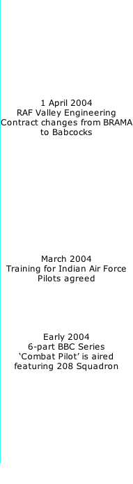 the 6-part television Series ‘Combat Pilot’ was aired on BBC2 (2), giving a detailed insight into the Squadron’s activities in 2002 as the documentary team followed the progress of one of the student courses as it progressed through training on 208 and 19 Squadrons. At the end of March 2004 Wg Cdr Clifford spent 5 days in Delhi visiting the IAF Training Headquarters with a team from BAE Systems to provide advice on the detail of the training package that was planned for the IAF pilots.