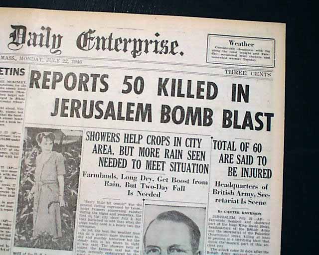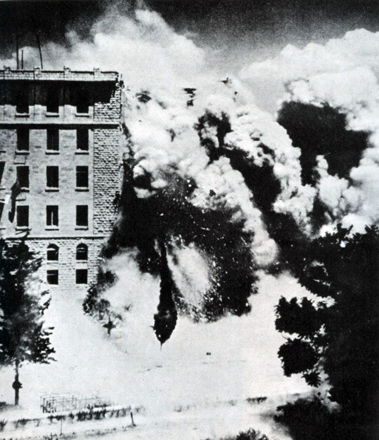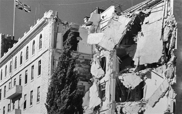 awaiting trial. In July they committed their worst act of terrorism to date when they left a number of milk churns, full of explosives, in the kitchen of the King David Hotel, Jerusalem. This blew up the wing housing officers of the Palestine