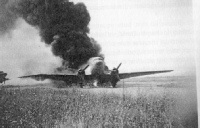 The third attack came just after 0900 hours when two aircraft again attacked the airfield. The first one dropped two fairly ineffective bombs near the hangar and then was chased south by Flying Officers McElhaw and Hully; the former shot it down. The second aircraft dropped one bomb on the Dakotas on the airfield and succeeded in destroying one. This Spitfire was then bounced by Flying Officer McElhaw who shot it down two miles east of the airfield where it disappeared into the ground with a loud explosion. Thus the day went to 208.