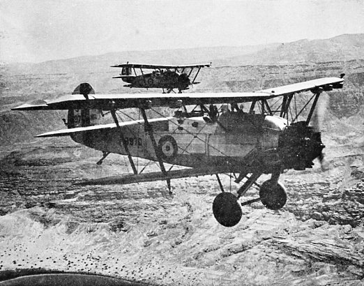 A taste of operations was to come the way of the Squadron in September 1929 when, as a result of the serious fighting over Palestine between the Jews and Arabs at the end of August, a composite flight of the Squadron was despatched to Ramleh as reinforcements. The flight of four aircraft commanded by Flight Lieutenant J J Lloyd-Williams MC, took off from Heliopolis on 17th September for Ramleh while the ground party, consisting of 18 airmen two Morris six-wheelers and one months stores followed up by train. At Ramleh the flight carried out daily reconnaissance flights over the disturbed areas taking air action against those seen burning or plundering villages. By the time they were relieved on 11th October they had carried out 162 flights involving 208 hours 25 minutes flying time.
