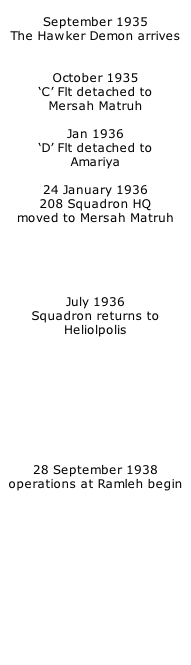 It was decided to establish a base at Mersa Matruh as Mussolini, in his attempts to reclaim the old Roman Empire, was building a wire-fence along the Libyan border. A detachment of ‘C’ flight was sent to Mersa Matruh in October and this was followed by ‘A’ flight in December. In January 1936 ‘D’ flight with its Demons was sent to Amariya, attached to 29(F) Squadron and finally the Squadron headquarters moved from Heliopolis to be established at Mersa Matruh East as from 24th January. Accommodation was under canvas and the Squadron was allotted to 5th Division for operations. Subsequently all personnel of D’ flight were posted to 64(F) Squadron on the formation of that unit on 16th March.