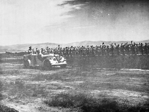end of the month the Wing was honoured by a visit of no less a personage than The King, travelling under the nom de plume of General Collingwood but known more affectionately to the colonials on the camp as “Pin up Pommie No. 1”. There was a great panic to clean up the camp and flight sites the day that the news arrived. On the following day a parade was held on the aerodrome, and when the King drove past the Squadron there were no less than 180 personnel on parade. By the end of the month the Squadron was on the move once more, this time to Malignano near Sienna, and it was with regret that its members left the banks of Lake Trasimeno.