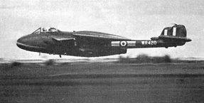 command and for the next year and the squadron flew in all areas within the Middle East Command from Rhodesia to the Persian Gulf. These long transit sorties were flown with rudimentary navigation aids and to the limit of fuel endurance! They even had time to form a formation aerobatic team that performed all round the region and actually looped 9 Venoms (10).