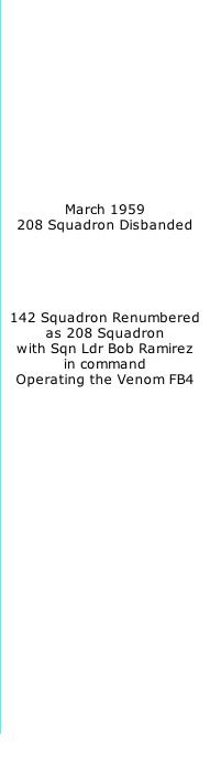 the squadron. This friction and the problem of poor serviceability could well have led to the decision to disband the squadron. The disbandment (6) took effect in March 1959; however, the next day 142 squadron in Nairobi Kenya renumbered to 208.