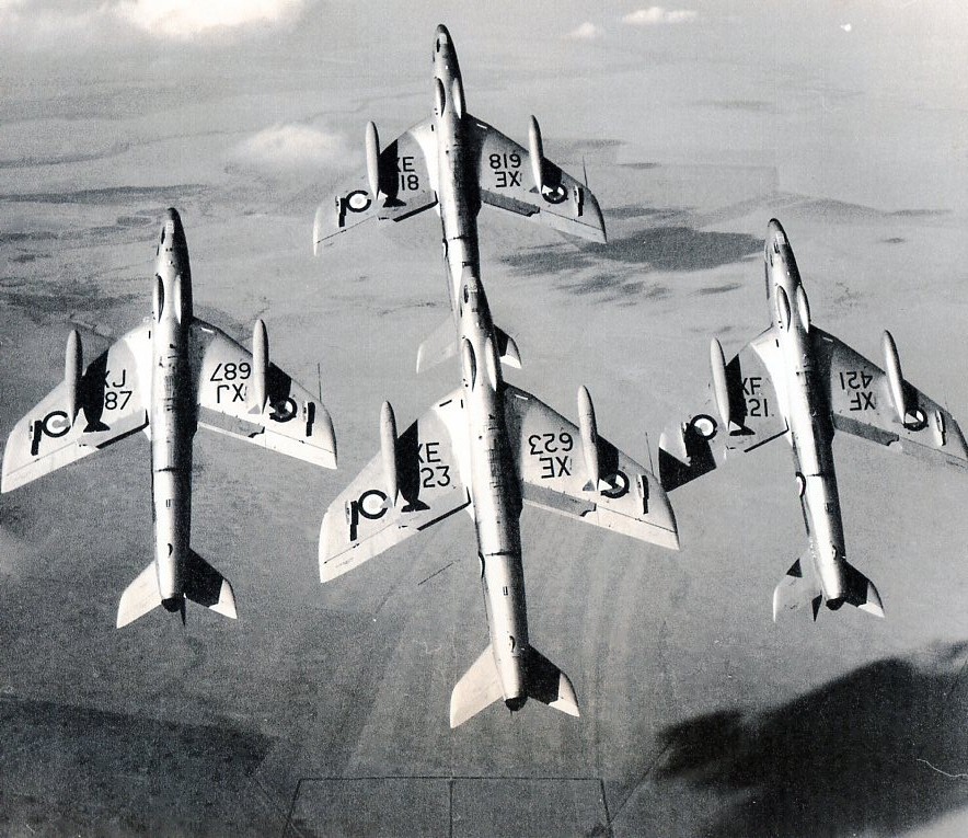 pilots and ground crew returned to Stradishall to convert to the Hunter FGA9. In May, they returned to Kenya by way of Malta, Cyprus, Diyarbakir [Turkey] Teheran, Bahrain and Khormaksar – 7000 miles in 21/2 days; at the time a record for RAF aircraft in transit. The Hunter could not operate of the 1500 yard strip at Eastleigh, so they transferred to