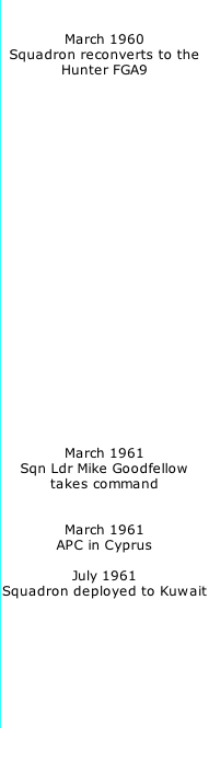 In March 1961 Mike Goodfellow took command of the Squadron and soon thereafter led a detachment to Cyprus for air-to- air Armament Practice Camp on the way there they ferried via Teheran and on the return via el Adem and Khartoum. On 26th June, following the threat of an attack on Kuwait by the Iraqis, the Squadron was given notice to prepare for a deployment to Bahrain and Kuwait. Three days later, they ferried their aircraft to Bahrain via Khormaksar and Sharjah; the next day a reconnaissance of Kuwait was flown and two days later the squadron moved in and immediately went on patrol of the Kuwait – Iraqi border.