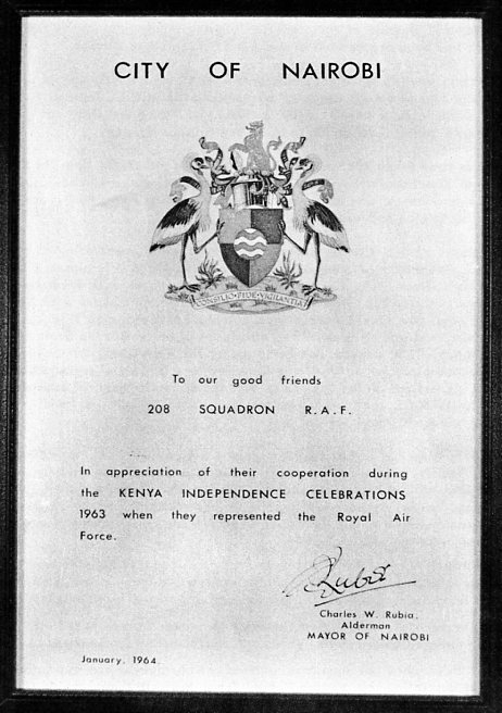 The operating conditions in the Middle East were tough: the temperatures in anything other than the cool season were very hot and humid. Most of us changed their flying suits for a clean one at least twice a week and even then, they became very uncomfortable. You drank copious amounts of water and as your time went on the amount of salt, you added to that water increased markedly. The standby pair never sat in the cockpit during readiness – the cockpits were just too hot to touch. Consequently you were allowed 10 minutes even on ordinary sorties prior to engine start and taxi. One of the Recce Flt’s pilots persisted in rolling his sleeves up between sorties and on one hurried start up, having omitted to roll his sleeves down, received severe burns on his fore arms from the cockpit sides. The desert sand got into everything and the outer surfaces of the aircraft were sand blasted to such an extent that for all we used temperate camouflage the sand blasting ensured that all the aircraft were well disguised. The canopies needed frequent changes if we were to see anything outside! In December 208 was detached to Embakasi for Kenyan Independence and that completed the full house because the Sqn had flown the independence celebrations for the three ex British colonies: Kenya (13), Tanganyika and Uganda!
