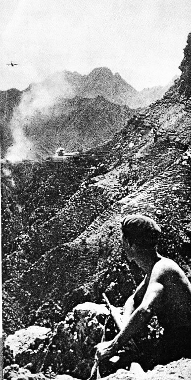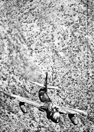 A few days later 8 Sqn were called in to attack a suspected arms dump at the base of an extensive cliff. The problems of firing into a cave at the bottom of a cliff from a 30 degree dive all done at about 5000 feet above sea level bears some thinking about but the 8 Sqn team did the job and the resultant explosion and increase in the cave’s size was a “joy to behold”. Our main offensive weapon on the Hunter at this time was the 60lb rocket – a weapon developed in the Second World War to be delivered against shipping from Blenheim and Beaufort aircraft. Originally they were fired at 240 knots in level flight from a range of 400 yards whereas we were firing them at 400 knots in a 30 degree dive against hard rock and therefore required a firing range of no closer to 800 yards; nonetheless shrapnel was still picked up. Initially the aircraft were firing the HE variety but they appeared to do no damage to the mud forts because the heads were penetrating the mud and detonating on the hard ground within the fort. Someone then came up with the good idea