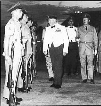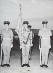-Bridges fame! Here the Standard Party [19], the Standard Bearer Fg Off Bob Partridge, unusually for him, shell shocked by the occasion – somewhat removed from his accustomed, singlies, carefree social life. There was an immaculate diamond nine flypast but the picture was very faded. Afterwards, Sir Geoffrey inspected the Squadron [20]. This is Dame Jean