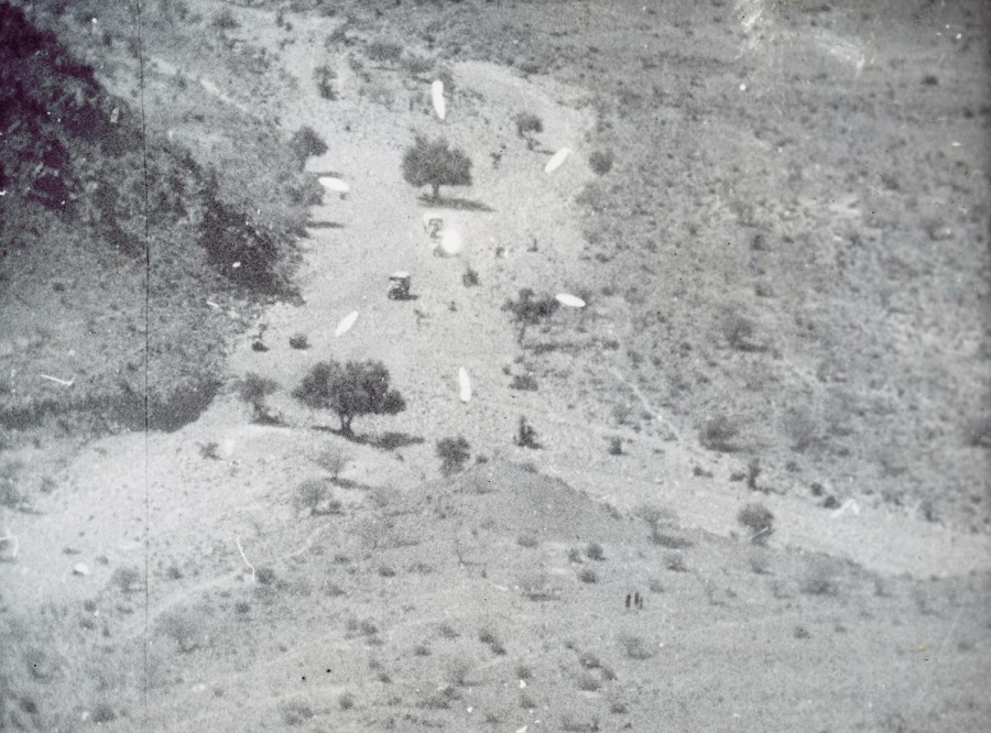 mounted long range sorties into Southern Iran, through the wadis and mountains of Oman and into the empty quarter, Leewa Hollows in the Rhub al Khali. Army co-op and forward air control exercises also took place there. Here are a couple of pictures: [28] Targets spotted – then [29] “Guns” attack – cine cameras only!