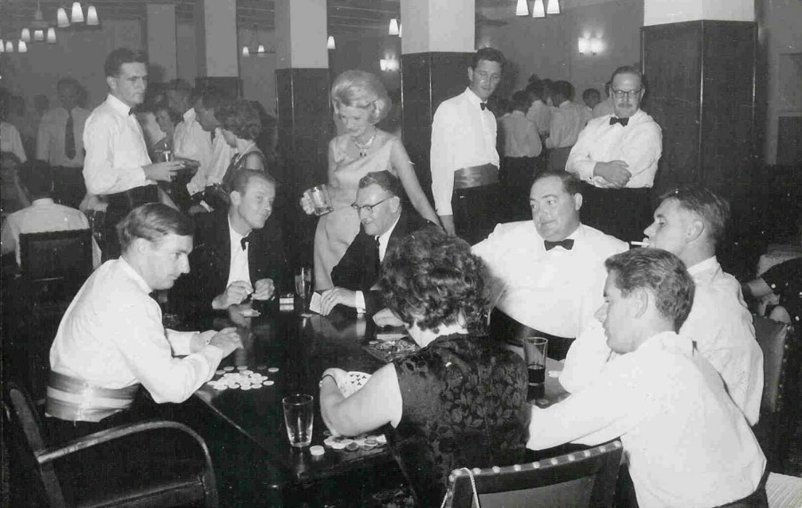 well and the prospects for the Squadron Fund looked dire. But someone was looking after the squadron. The last turn of the wheel , with the table stacked with bets – up comes ZERO - House takes all and sighs of relief all round. Here [37] is a much more sedate looking table of Black Jack.