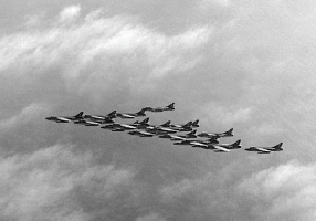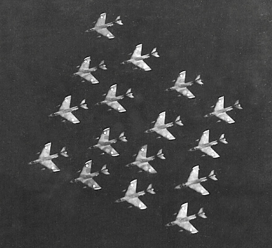 "The flypast was nearly a disaster when the lead Sea Vixen crew thought that we were 30 seconds early and suddenly with little warning slowed down from 350kts to 300kts. The cumulative effect on the formations especially at the back end was interesting to say the least.”