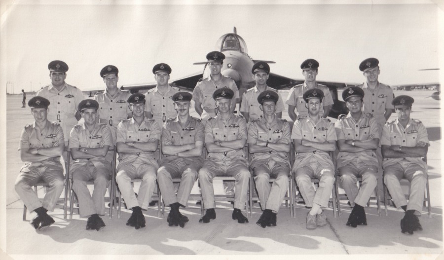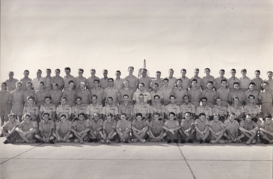 Shortly after my arrival on the Squadron the picture to the right was taken of groundcrew and aircrew together. Pete Day and I were the most recent arrivals.