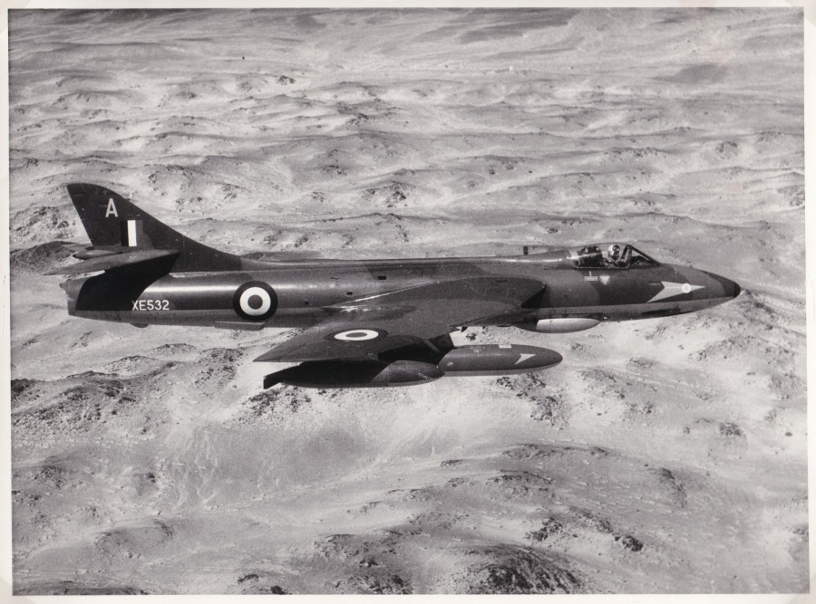 The much-vaunted Hunter FGA 9, in this case the Boss's aircraft being flown by our saturnine Stu (Eastwood) when on detachment to Masirah for reconnaissance duties. The photo was taken by our friend 'Spy-Pilot' Ken Simpson from one of 1417 Flight's FR10s. There is nothing much in this area but sand.