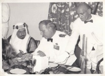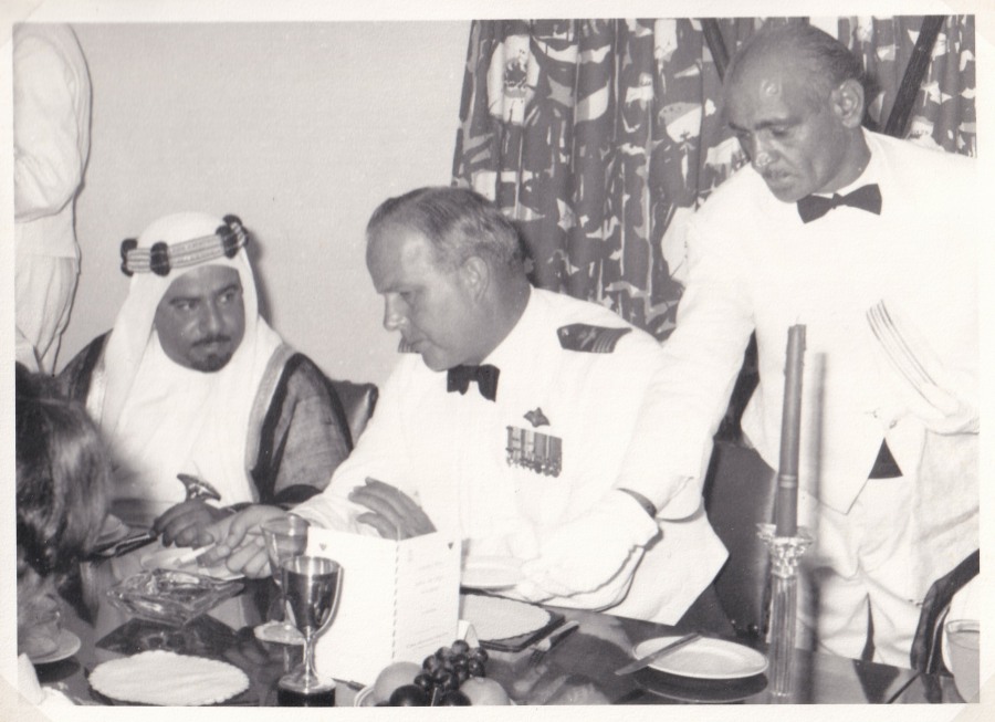 RAF Muharraq; a rare event, and is pictured to the right being entertained by the Station Commander, Group Captain B G Frow. Hovering in the background is the ever-lurking Nehrooz, known to most as Number One. He has served the Mess for some years. The Ruler and assembled company were later subjected to a musical soiree! Click on the picture on the left to read the Menu for the Ruler’s Dinner.