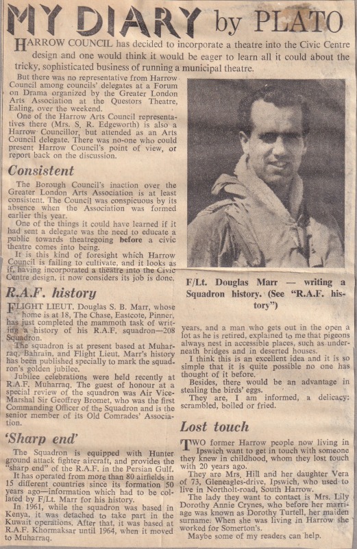 after his arrival on the Squadron, the poor unfortunate in the accompanying photograph was 'joed' to write the Squadron History in preparation for the 50th Anniversary on 25th October 1966. By dint of an absolutely enormous amount of work and research on the author's part a volume of extremely first-class prose - describing first-class history of course - was produced. 500 copied were optimistically ordered and strange to relat the Squadron, as a result of Dave Longden's high-powered salesmanship, has disposed of them all. It is reputed that some dubious aviation bookseller in London has a market for 200 copies. China, probably!