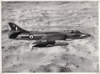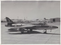 The 'T-Bird' is a strange, ungainly, underpowered beast - an unmentionable two-seat bastardisation of our 'Queen of the Skies' FGA 9. One's first Squadron flight is invariably in one such as the above - the latter incidentally was borrowed from Khormaksar and immediately acquired a '3' after its TW Fleet marking, also the 208 insignia to add to 8-43 - the first 'Tripartite Hunter'?
