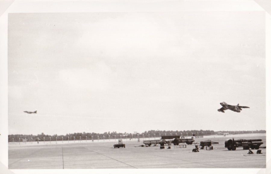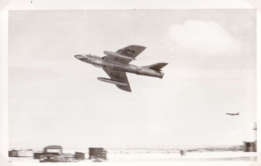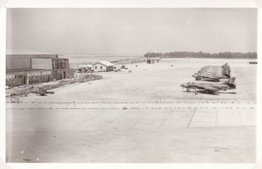 humid and hazy. The ground crew working in shorts only, are only too happy to get back to their air-conditioned crew-room if they can, before the next job. The Hunter line, on the airfield perimeter, is surrounded by barbed wire. The hangar, in front of which Squadron buildings are in the process of construction, house aircraft needing repair work or servicing which cannot be completed on the line.