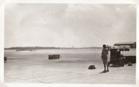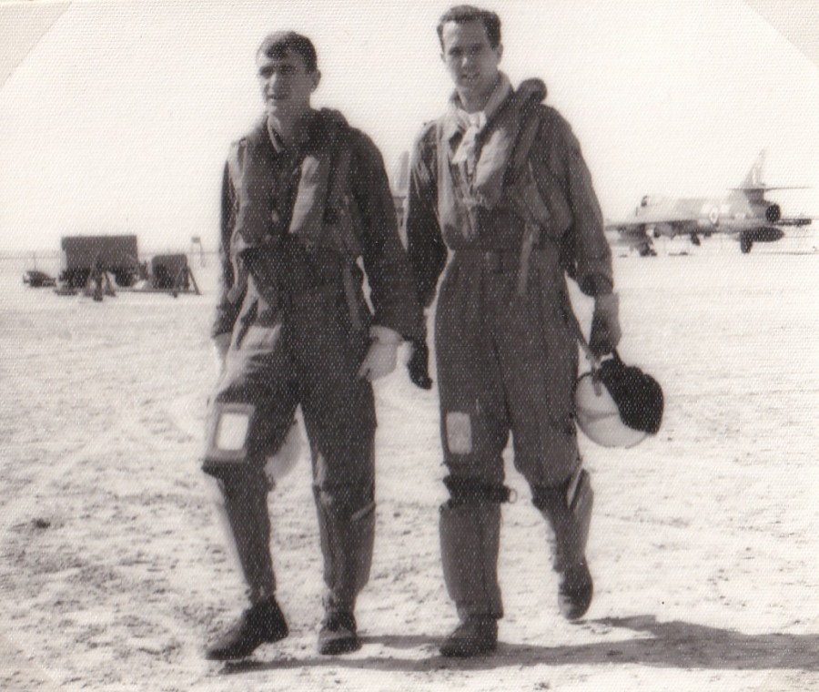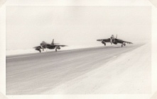 Here Hammy Armstrong and I are returning from a sweaty session on the range with 3-inch rockets and front guns. Stefan Kawowski, our ever-ready camera man happened to be up the runway to film our take-off. It was a pity that he 'fell over' just after taking the photo below! F-Foxtrot, incidentally, was my own aircraft and a fine bird she was too! Sharjah's runway incidentally is only half as wide as Muharraq and pairs take-offs are flown that bit more keenly!