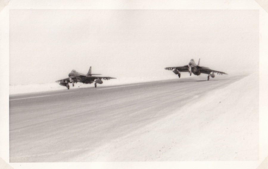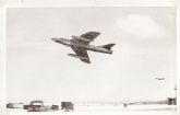 Almost all training involves at least one pair of aircraft. Consequently, we get plenty of practice at pairs take-offs. A somewhat exaggerated tactical take-off here, by self, enabled me to include a 'visit' to the Squadron's line hut - just to remind them that they had put another Hunter in the air! I should have remembered at the time that this sort of thing is 'not on' with rockets on board!