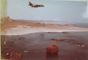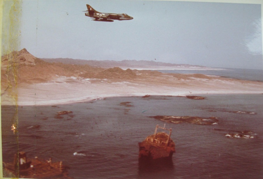 The painting was based on this photo taken in November 1970 by John Metcalfe, of me flying a 208 Squadron Hunter FGA9 over the wreck of the SS World Jury at the south end of Masirah Island, Oman.