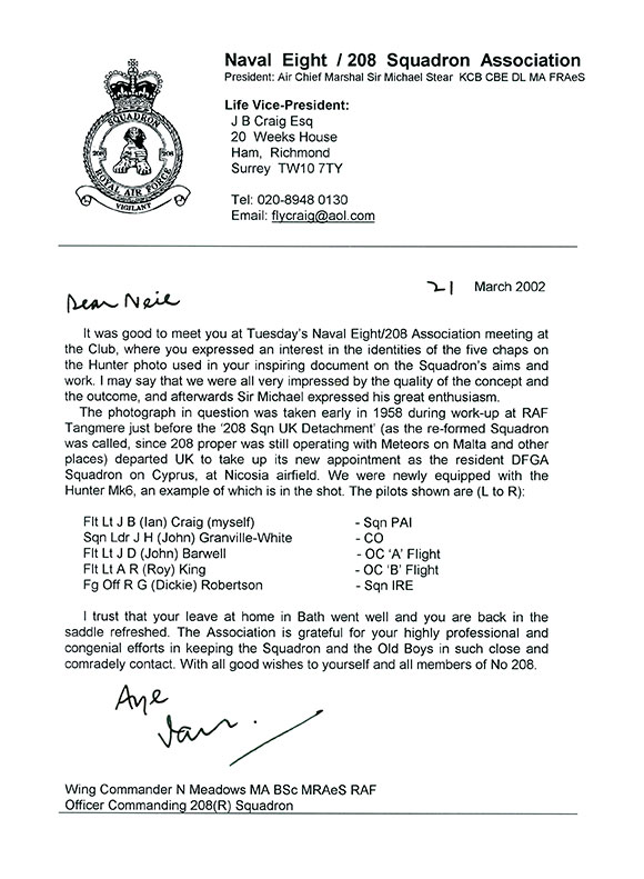 Ian was immediately and generously supportive, offering advice and insight into some of the historic photographs that were being proposed for use. One particular shot of Squadron Leader John Granville-White and some of his pilots at Tangmere during the conversion to the Hunter, was of particular interest for development into an inspirational quotation to inspire the young trainee pilots of the day. In yet another example of Ian’s unremitting altruism, he wrote to Wing Commander Meadows to identify all those in the photograph including, of course, himself on the left. There can perhaps be no more fitting epitaph to Ian Craig’s enduring spirit than the words of the quotation below.