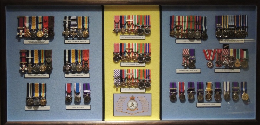 The medals project began in 2001 and initially was to create a collection of full-sized medals around the Bromet set. However, the realisation of the value of the Bromet set, combined with the anticipated cost of expanding that collection, brought us to realise we couldn’t afford it, so it was decided to revert to the idea of miniatures, with the added suggestion from our medals expert, Air Cdre Graham Pitchfork, that we make them more personal by creating a group of individual sets awarded to members of of the Squadron down the years. That’s how it all began and over the ensuing years, we have been enlisting your support with donations and your Historian has been bringing together the collection from a wide variety of sources, some as far away as Australia. The original 49 expanded to the 70 you see above.