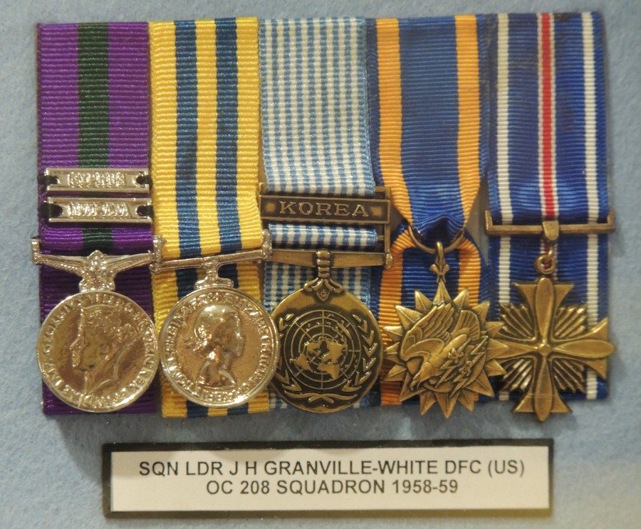 On 29th June 1953, the 39th was scrambled to counter a North Korean attack on one of these air lifts. During this engagement, Flight Lieutenant John Granville-White shot down one MiG-15 and scored another, unconfirmed, kill”. In the fierceness of that air combat and for his tenacity against the enemy, Flt Lt Granville-White was awarded the United States Air Force Distinguished Flying Cross, one of only fourteen awarded to foreign recipients, having already been awarded the US Air Medal. The standard pair of Korea campaign medals, the British and UN issues, plus the Cyprus clasp to the GSM, complete John Granville-White’s medal set.