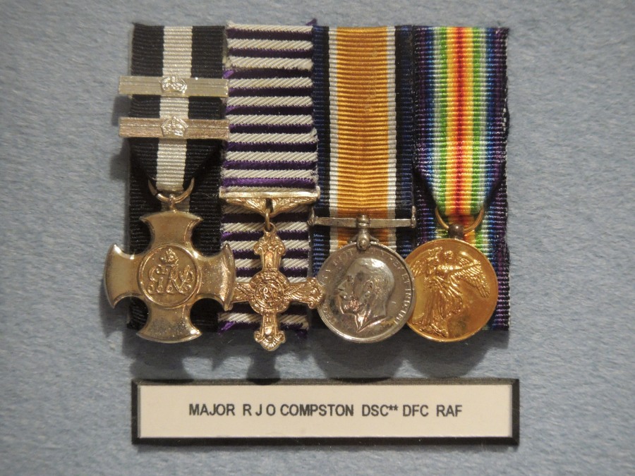 He joined Naval Eight in February 1917 and by April had made his mark, by being awarded his first Distinguished Service Cross. Ever at the front of combat, he was awarded a bar to his DSC in June of the same year and by November a second bar made Robert Compston’s DSC a triple. In August 1918, after Naval Eight had become 208 Squadron, Royal Air Force, Compston was awarded the Distinguished Flying Cross. This medal is unusual, in that the first type DFC had a ribbon with horizontal purple and white stripes. The diagonally striped ribbon came into use after December 1919. He too received the the British War Medal, 1914-1919 and the 1914-18 Victory Medal.