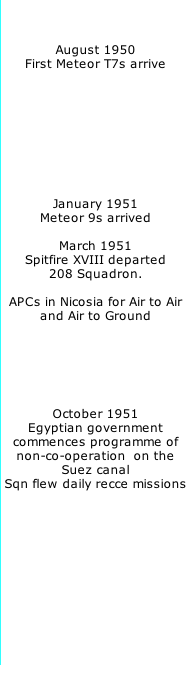 I returned to the Squadron in mid-December 1950 and the new aircraft commenced to arrive in the February of ‘51. The conversion period slowly proceeded and during that time I recall two major incidents: the first was at APC when, on a ground attack, the pilot failed to effect recovery in time. That was a heavy blow for the Squadron but, in my opinion, could be listed under “conversion” since the response to the stick in the pull out was very different from that of the good old “Spit”. A second crash, but with a happy ending, occurred when a newly arrived young pilot was about to land the Meteor 7 at Fayid. At the point of touchdown, the aircraft landed heavily, careered off the runway, across the desert and stopped when it hit a solid built guard-post. The post was completely destroyed, the aircraft wrecked and the pilot a little shaken but generally in good form.