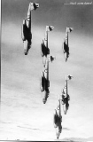 The piece-de-resistance of the flying display was a loop and a roll by eight aircraft (8). We had done a diamond nine in smooth upper air, but very precise flying by the leader was needed if you were not to lose the No 9, so it was not attempted on the day. I was flying No 5 and had my work cut out in the turbulence; remember we had no power assisted controls and an old fashioned elevator trim wheel, which
