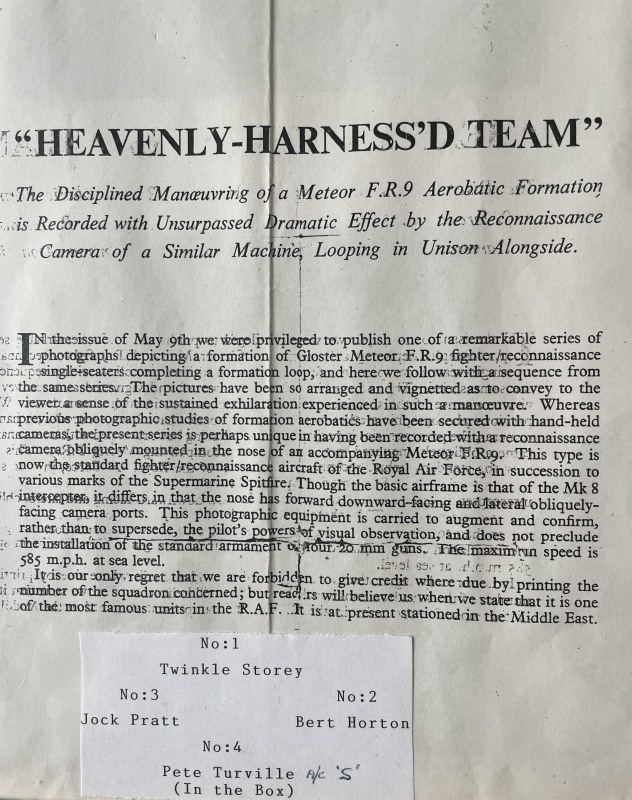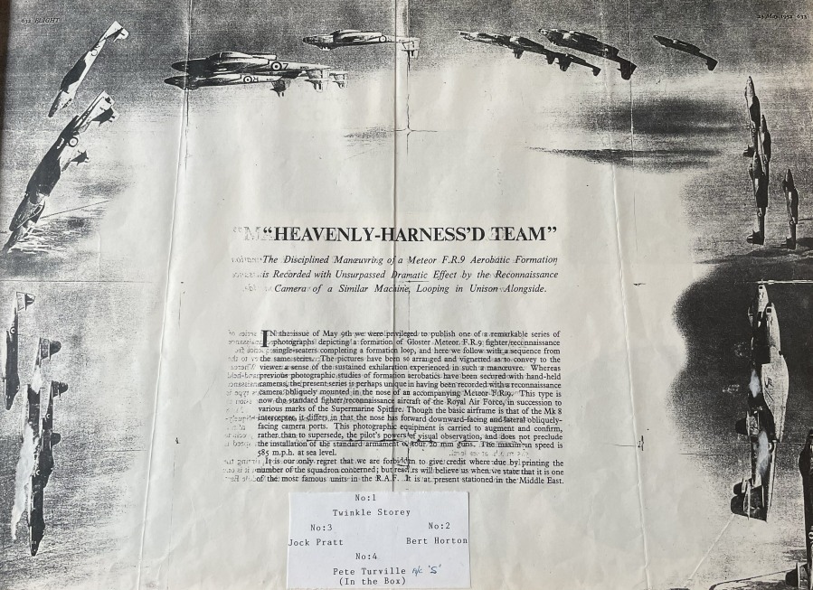 periods, a group consisting of my closest friends, Twinkle Storey, Jock Pratt and Bert Horton, discussed Formation flying and the acrobatics of a group of Meteor planes stationed in the UK. We thought that if “they can do it in England, why couldn’t we do it better in Egypt?” Conditions there were better than those in England. There was more space, visibility was literally miles better and the weather was more predictable and more constant. Egypt was a natural arena for aerobatics, and we decided to “Give it a go”!