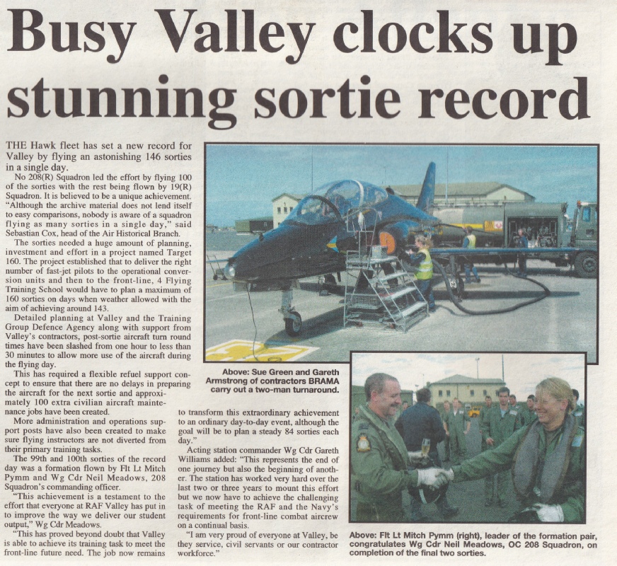 The Hawk Fleet has set a new record for Valley by flying an astonishing 146 sorties in a single day. No 208(R) Squadron led the effort by flying 100 of the sorties with the rest being flown by 19(R) Squadron. It is believed to be a unique achievement: "Although the archive material does not lend itself to easy comparisons, nobody is aware of a squadron flying as many sorties in a single day," said Sebastian Cox, Head of the Air Historical Branch.
