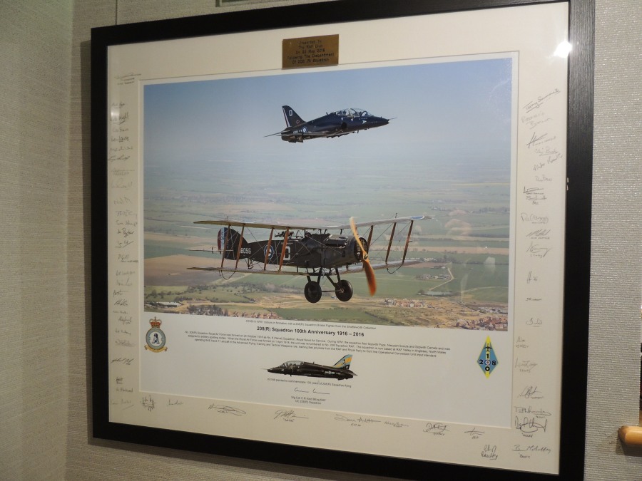 promised by the Vice-Chairman of the RAF Club, the framed photograph of XX350 in formation with a Bristol Fighter, which had been signed by all final members of 208 Squadron, and which had been presented to the Club on the occasion of the Laying-Up of the Squadron Standard on 22 May 2016, was on display. Former Squadron Commanders present were Graham Pitchfork (Buccaneer 1979-81); Ben Laite (Buccaneer 1981-84); Brian ‘Boots’ Mahaffey (Buccaneer 1987-89); Nigel Huckins (Buccaneer 1992-94); and Neil Meadows (Hawk 2001-03).