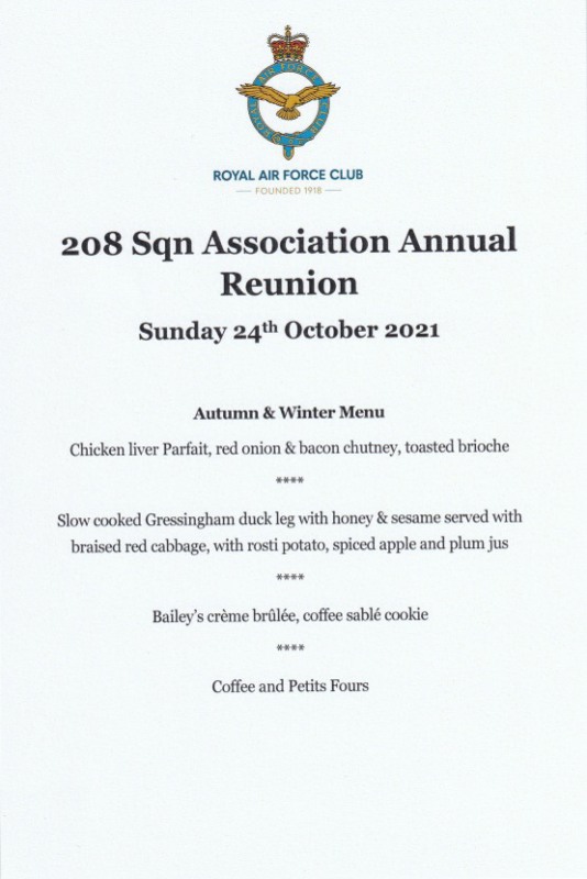 to the Hunter era, he recalled that, as a member of 8 Squadron, 208's sister Squadron in Bahrain, he had many fond memories of 208 Squadron in that period. Many of his 'chums' from this time were 208 Squadron members and he was particularly pleased to see Dave Stanley, John White, Nigel Champness, Gordon Reekie and Iain Ross, with whom he had served. The Hunter Boys were back in Town, and he thanked Iain Ross for whipping them all into this particular formation. He recounted many of the 'tales of derring do' of the 208 Squadron Hunter era, which he assured everyone were all truthful, and which had been faithfully reproduced in the bumper 2021 Edition of the Association Magazine, for which he gave fulsome and deserved credit to the Editor, Malcolm Ward.