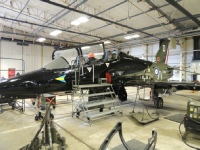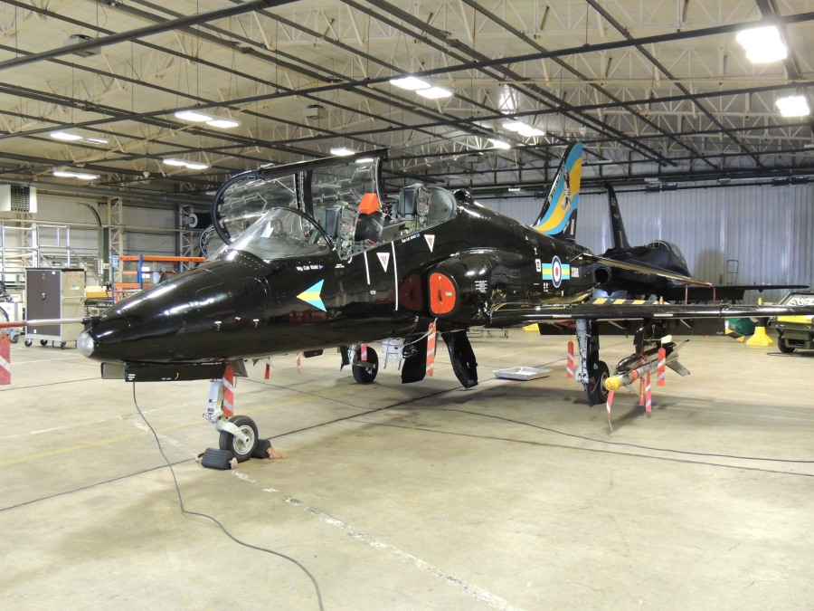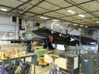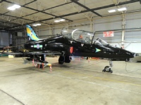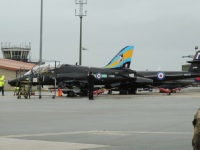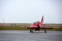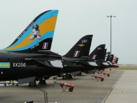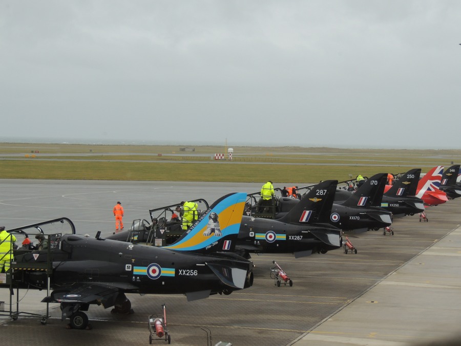 Whilst the formation was positioning in the ever-deteriorating weather, the visitors (or at least those who would brave the rain and he wind) were entertained by flypasts by representative aircraft form the wider Royal Air Force, and by some static displays. In the hangar were both XX350 – the 100th Anniversary Jet, and XX188, resplendent in the 100th Anniversary Tail Fin. Some guests enjoyed trying on Hawk flying kit in the Squadron Nav Room.