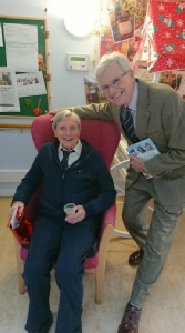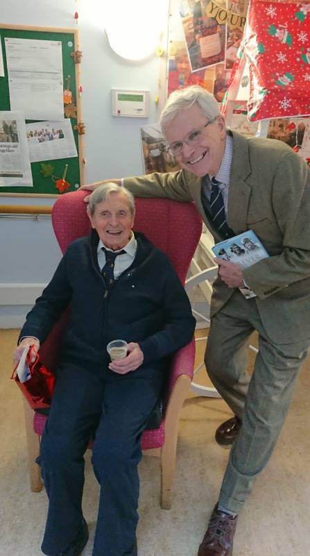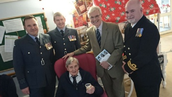 Barbara Carlin, a Carer in a Residential Care Home in Steyning, Sussex, where Donald now lives, contacted us to say that Donald was going to be 100 years old on 1st January 2019. As well as family celebrations on the day, it was planned to hold a party on Friday 4th January. Our ever efficient Webmaster, Neil Meadows, swung into action and approached RAF Swanwick, the nearest RAF unit. On 4th January, I arrived at the Home to meet Barbara, Wg Cdr Gez Currie from Swanwick and his two comrades, Lt Cdr “Digger” Evans RN and Warrant Officer Andy Cracknell, all very smart in their No 1 HD. Also gathered were the other residents of the Home, together with Charlotte, another Carer, who took the photos. Barbara then brought Donald into the party amidst great hurrahs and cheering and lots of good wishes. Donald was on good form, well turned out and certainly sprightly. Best of all, he was proudly wearing his 208 Sqn tie, with the gold Sphinx in pattern. Once we were all equipped with a “glass,” we toasted Donald and his great achievements, before a passionate rendering of “Happy Birthday to You!” The Chef from the Home then appeared with a super, lavishly iced, sponge cake.