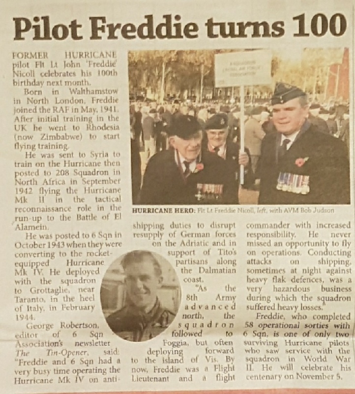 Former Hurricane pilot Flight Lieutenant John 'Freddie' Nicoll celebrated his 100th birthday on 5 November 2020.