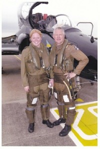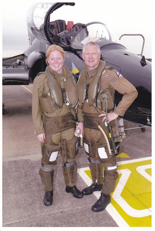 Once Kirsty began flying training, it was always her father’s ambition to be able to fly with his daughter. Pictured here are Kirsty and her father alongside the 208 Squadron Hawk in which they flew their mixed-