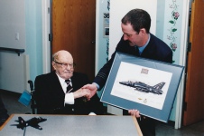 We had brought a number of items with us to present to Henry in commemoration of his service with the Squadron. First of these was a gift from the Association of a framed copy of the Squadron’s Battle Honours. Not just those on the Squadron Standard, but also those actions that, according to the Historian at the time, Dr David Styles, would have been included had 208