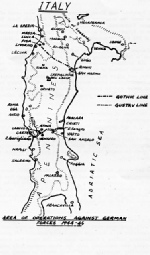 Trigno was an interesting airfield – well it was not an airfield as such – the Royal Engineers had laid PSP (Pierced Steel Planking) on sand near the shore and if you ran out of PSP you were in trouble as I found out once when a tyre burst on landing and I ran off and pitch polled to land upside down. We started ops the next day and the first one I recorded was an offensive sweep, and my initiation into German Flak. Over 60 years on I cannot remember much about it but we went on for several weeks working with the 8th Army on TacR’s and ARTY R’s (ARTY R’s are artillery shoots with the army on specified targets). We had a Major and two Captains attached to us who used to brief us on what the army wanted us to do. Shoots are bracketing a target by observing the smoke on a shell burst and either upping or dropping so many yards until the target is hit.