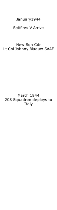 taxying. As in the Hurricane we had to sit in the cockpit reading and digesting the pilots notes as there were no dual control aircraft – mistakes could be fatal. The undercarriage lever on a Spit was on the right hand side of the cockpit, while on the Hurricane it was on the left hand side. Initially until you got used to it you could see the wings wobbling while changing hands on the control column on take off. Soon after the Spitfires arrived we also had a new commanding officer – Lt Col Johnny Blaaw DFC of the South African Air Force. He had been with 40 S.A.A.F. in the desert and was a first class leader of the Squadron.